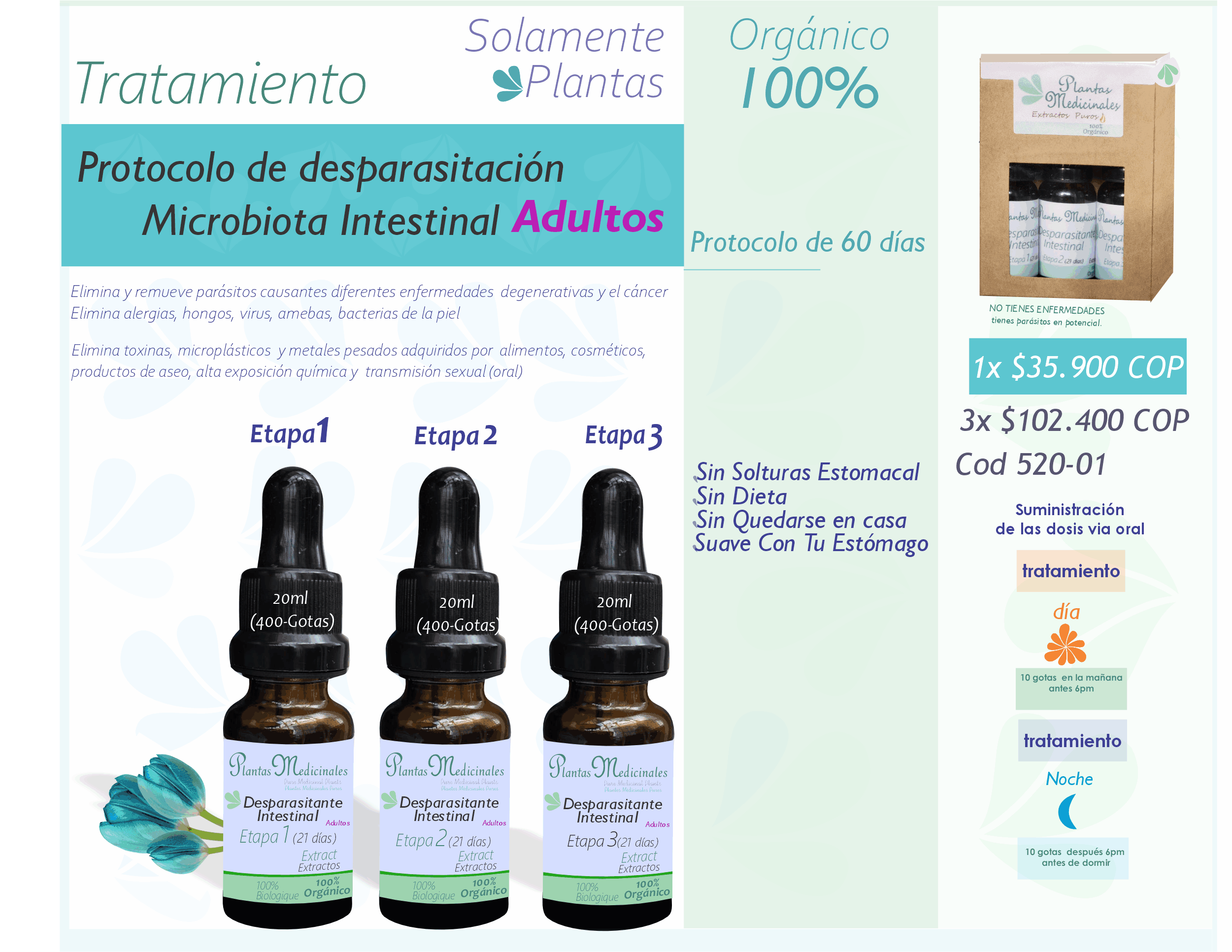 Beneficios: Elimina y remueve par?sitos causantes diferentes enfermedades degenerativas como el c?ncer. Elimina alergias, hongos, virus, amebas, bacterias de la piel. Elimina toxinas, micro pl?sticos y metales pesados adquiridos por alimentos, por cosm?ticos, productos de aseo, por alta exposici?n qu?mica y transmisi?n sexual (oral)